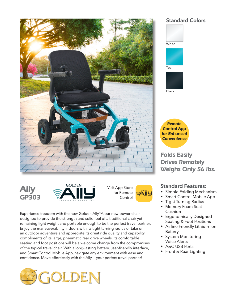 The original Ally combines the durability of a traditional power wheelchair with lightweight, easy-fold portability. Its tight turning radius makes indoor navigation simple, while large pneumatic rear wheels deliver a smooth ride outdoors. Adjustable seating, memory foam comfort, and app-based smart control make it your perfect travel companion.