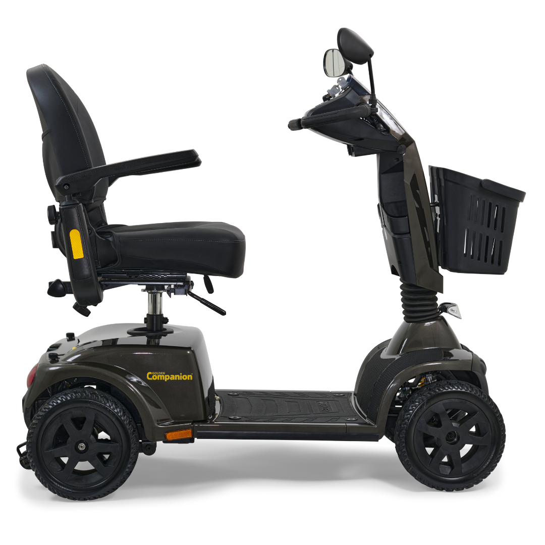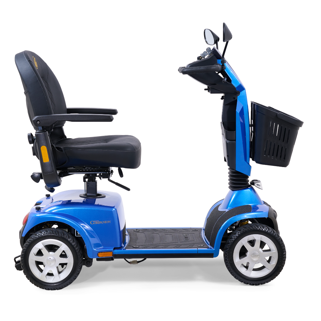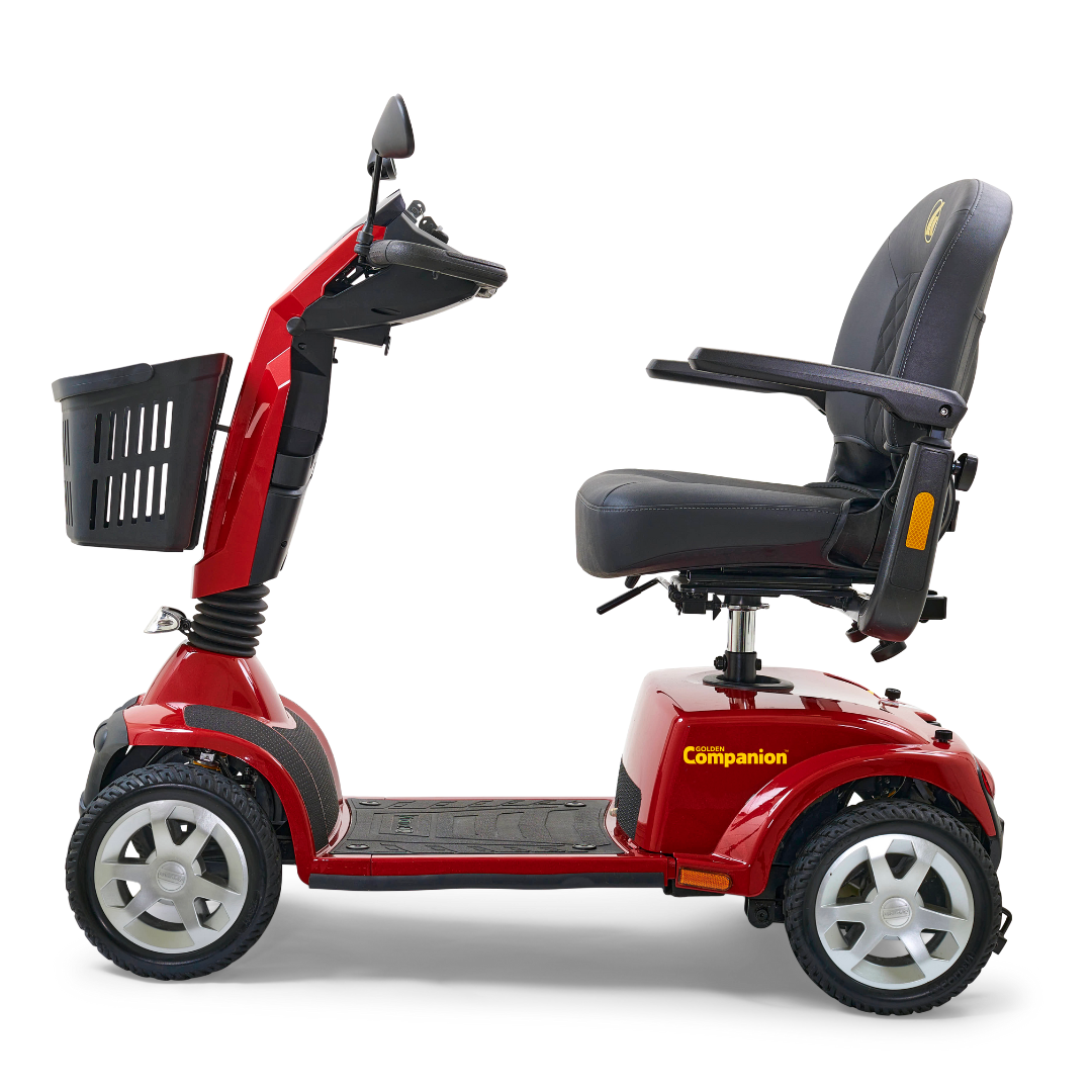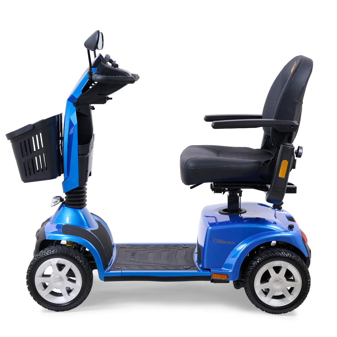 Golden’s popular Companion 4-Wheel Scooter now features a sporty new design and enhanced comfort upgrades! This next-generation model includes a wider, infinitely adjustable tiller paired with a digital dashboard that displays a precise battery percentage, along with water-resistant control buttons for added durability. Dual built-in cup holders add convenience on the go.