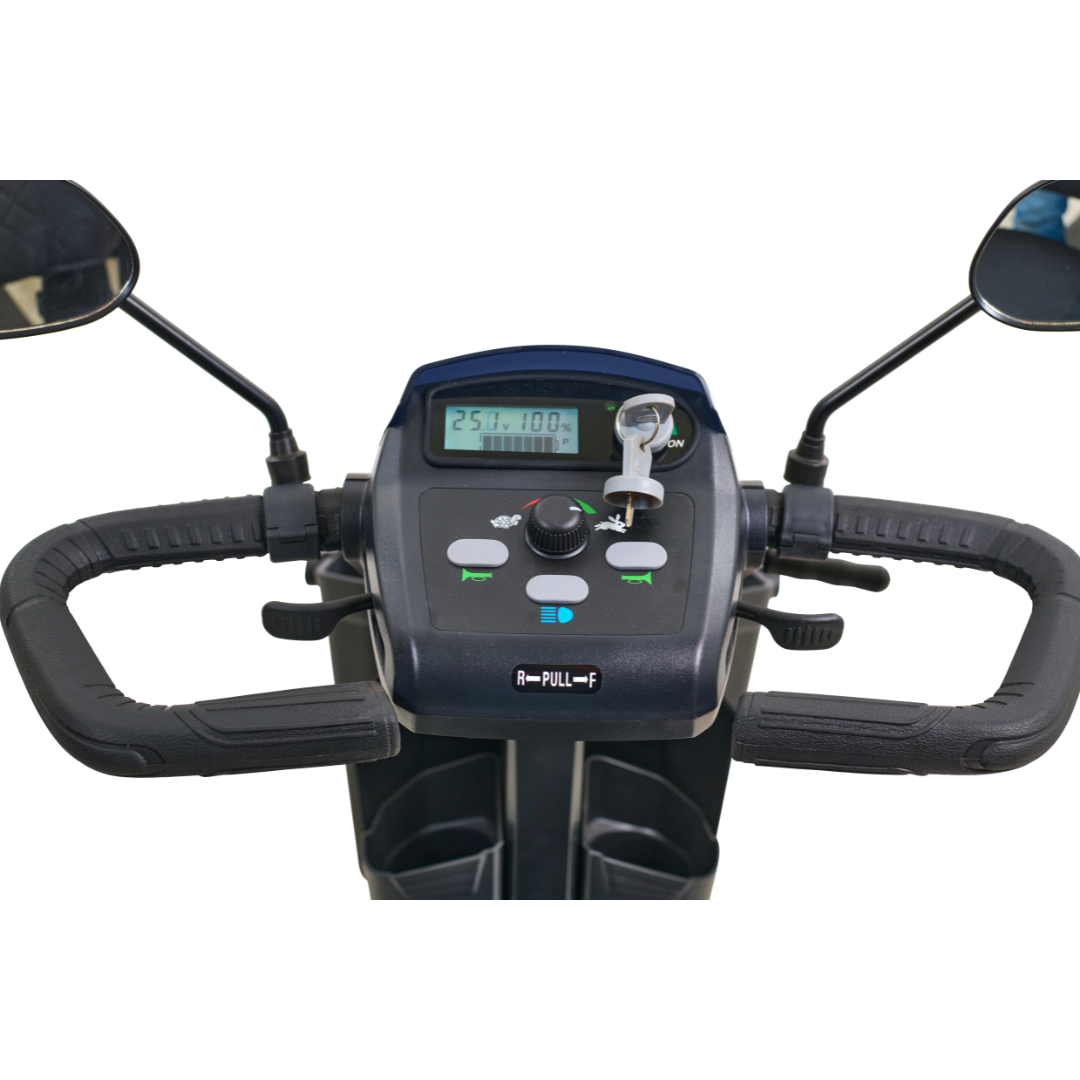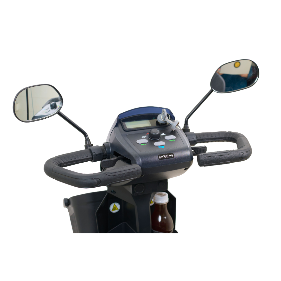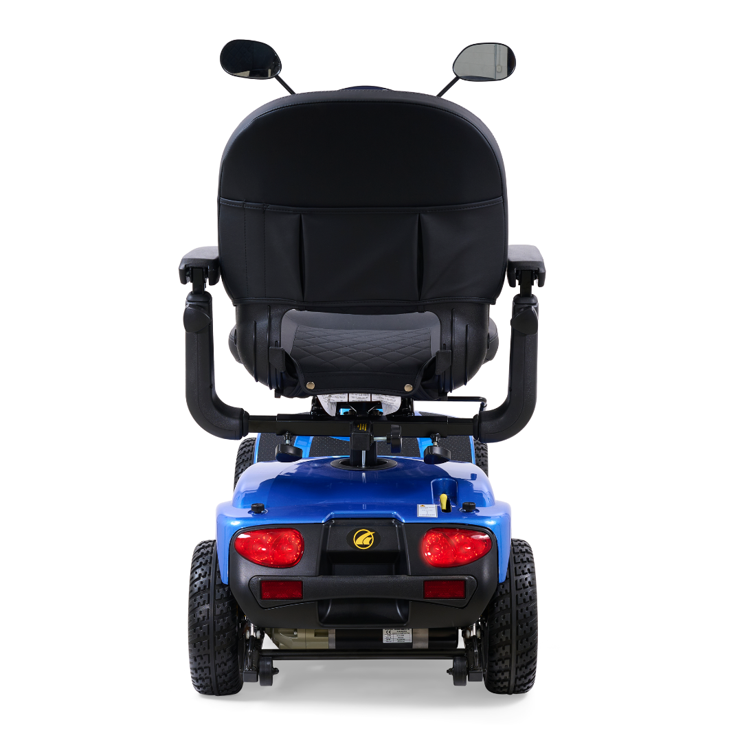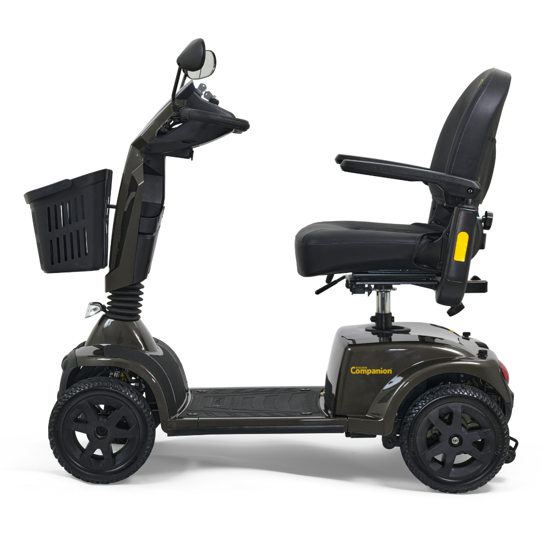 Golden’s popular Companion 4-Wheel Scooter now features a sporty new design and enhanced comfort upgrades! This next-generation model includes a wider, infinitely adjustable tiller paired with a digital dashboard that displays a precise battery percentage, along with water-resistant control buttons for added durability. Dual built-in cup holders add convenience on the go.
