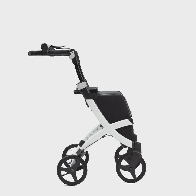 Our designers developed a lightweight rollator walker with different levels of support. When the handlebar is all the way up, it offers light support and the possibility to steer it with one hand. If the handlebar is placed all the way forward, it offers maximum stability.