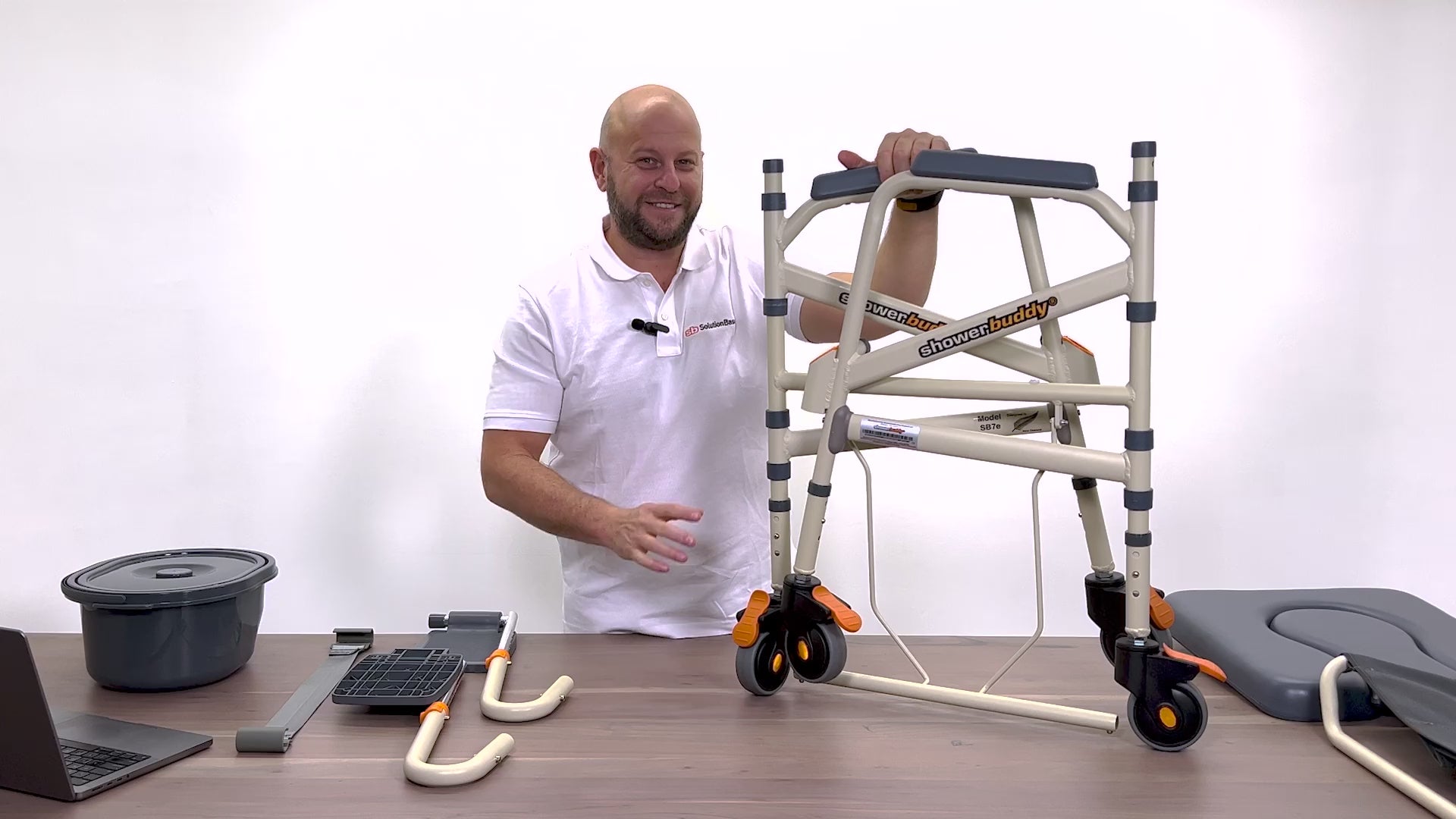 The ShowerBuddy Eco Traveler (SB7E) is purpose-built for use in curbless, accessible, and roll-in shower stalls, offering exceptional versatility for both home and travel. This lightweight yet durable shower chair can roll directly over most toilets for use as an over-toilet commode and also functions as a bedside commode when needed.